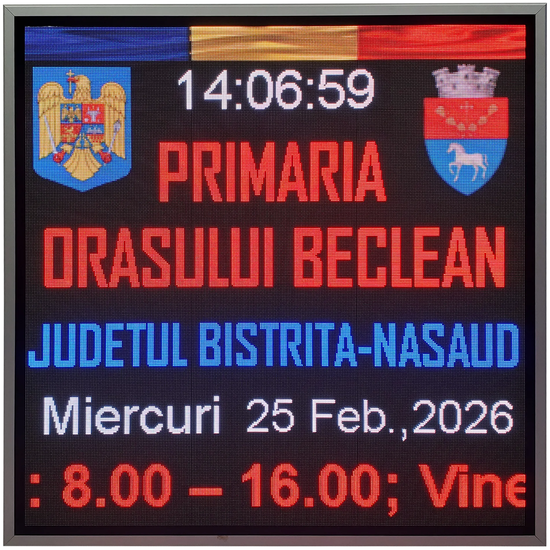 Un panou LED amplasat la sediul institutiei devine un punct oficial de informare pentru comunitate. Anunturi importante, convocari, programe, campanii locale sau mesaje de interes public pot fi transmise clar, fara intarzieri si fara costuri repetate de tipar.