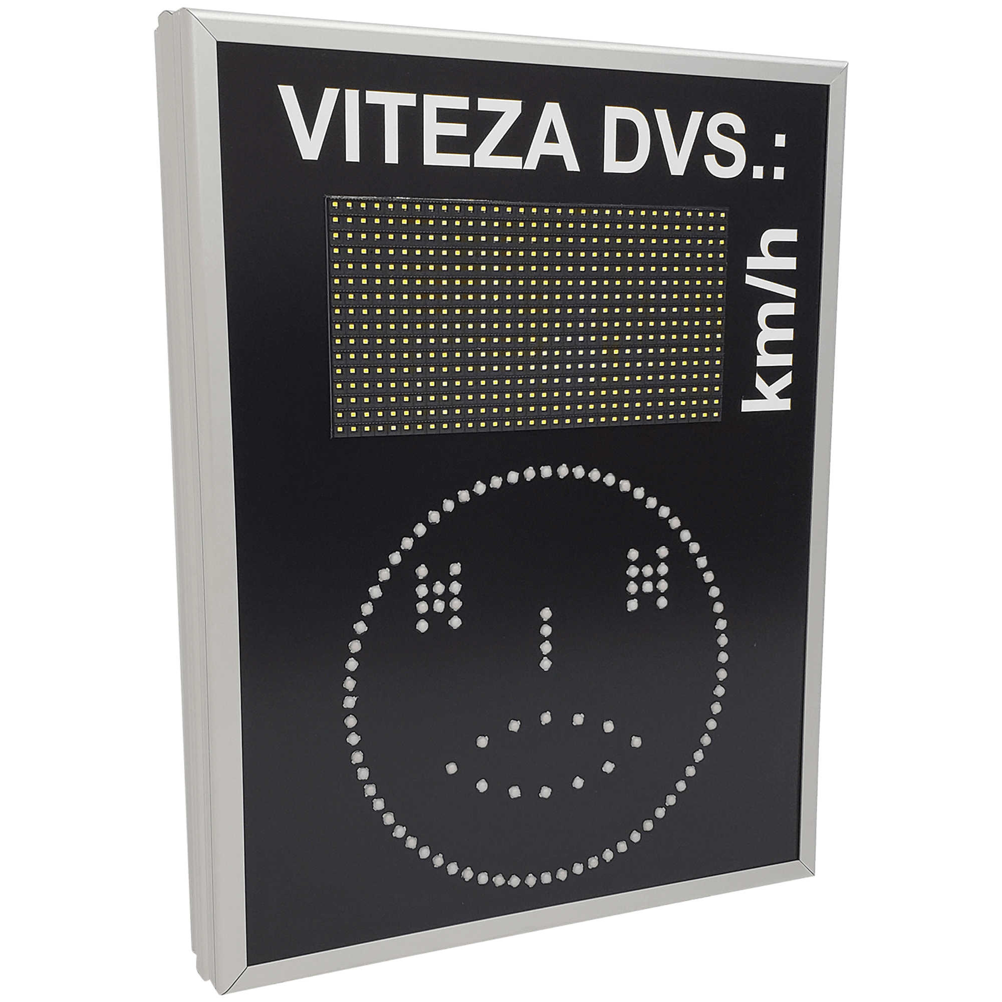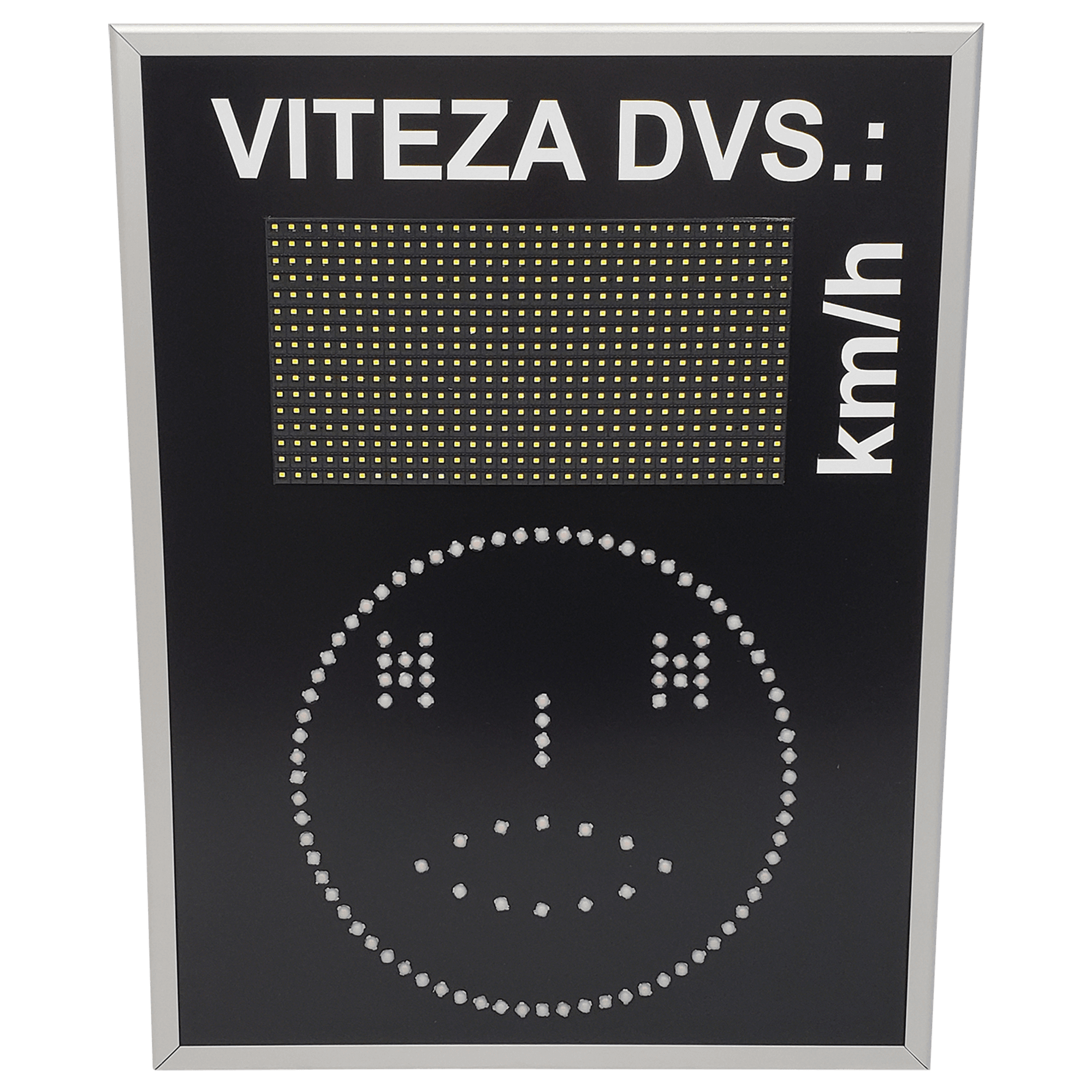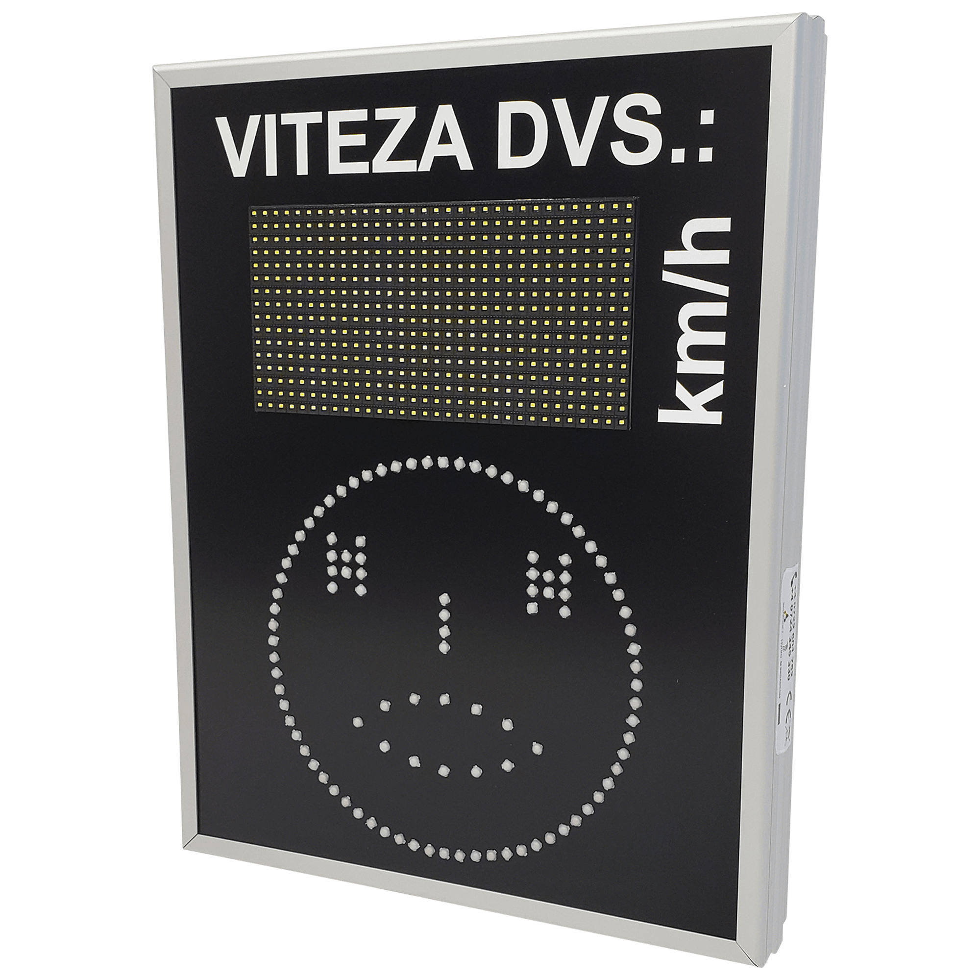 Afisajul LED P10 cu LED-uri albe asigura vizibilitate foarte buna de la distanta, atat ziua, cat si noaptea. In functie de viteza detectata, indicatorul afiseaza valoarea masurata si schimba expresia grafica: fata zambitoare pentru viteza legala si fata trista pentru depasirea limitei.