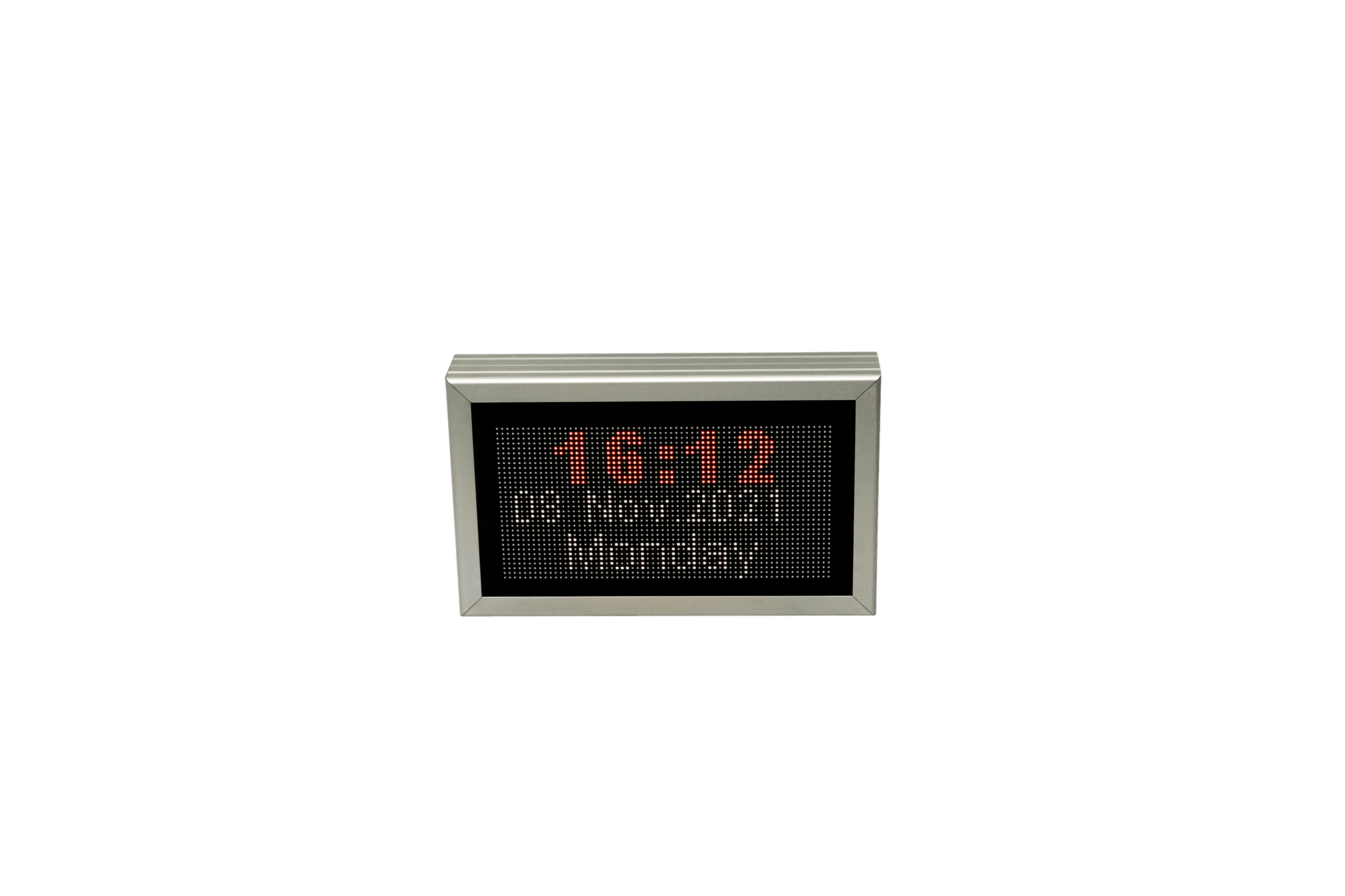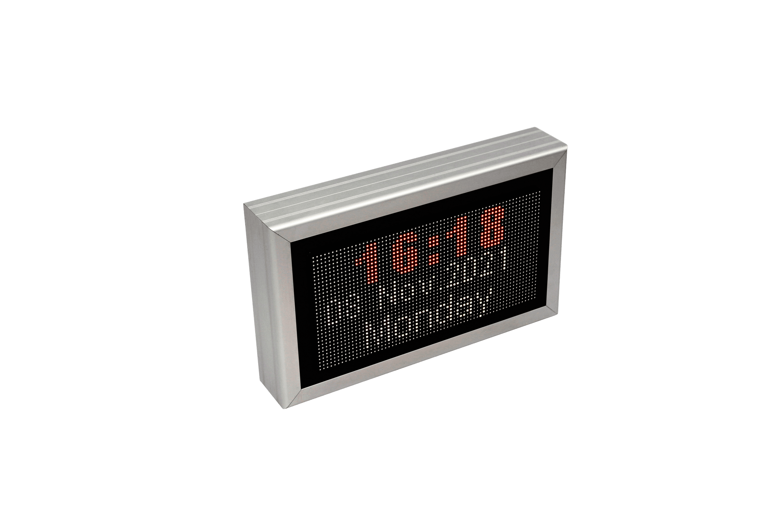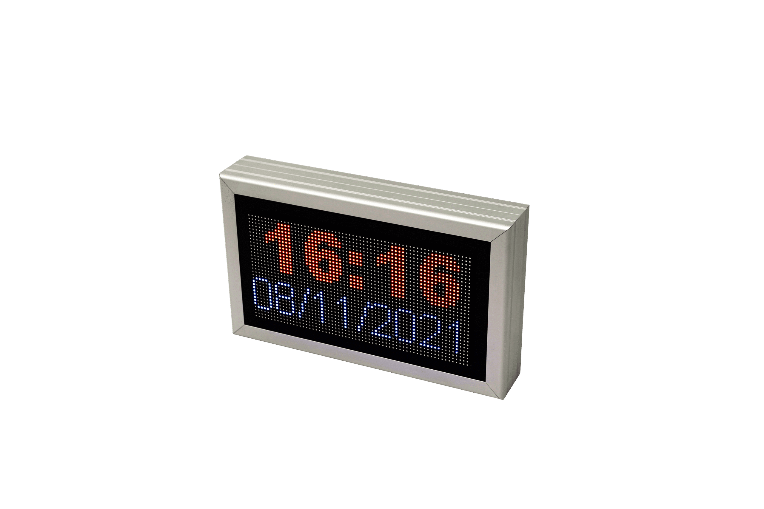Afiseaza ora, data si ziua saptamanii, iar optional poate integra temperatura sau mesaje personalizate. Datorita tehnologiei RGB, continutul poate fi redat in culori diferite, adaptate identitatii vizuale a locatiei sau evenimentului.