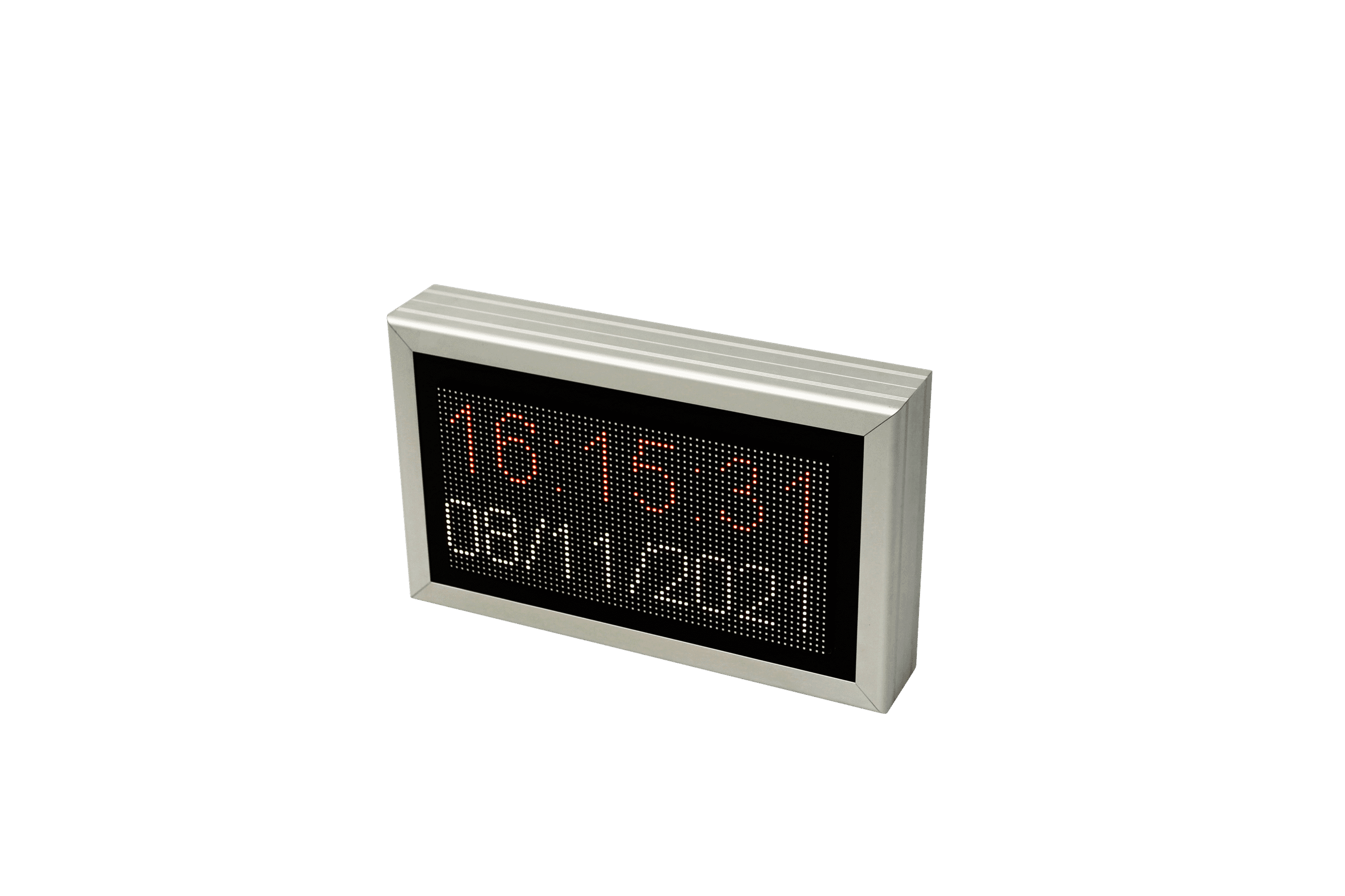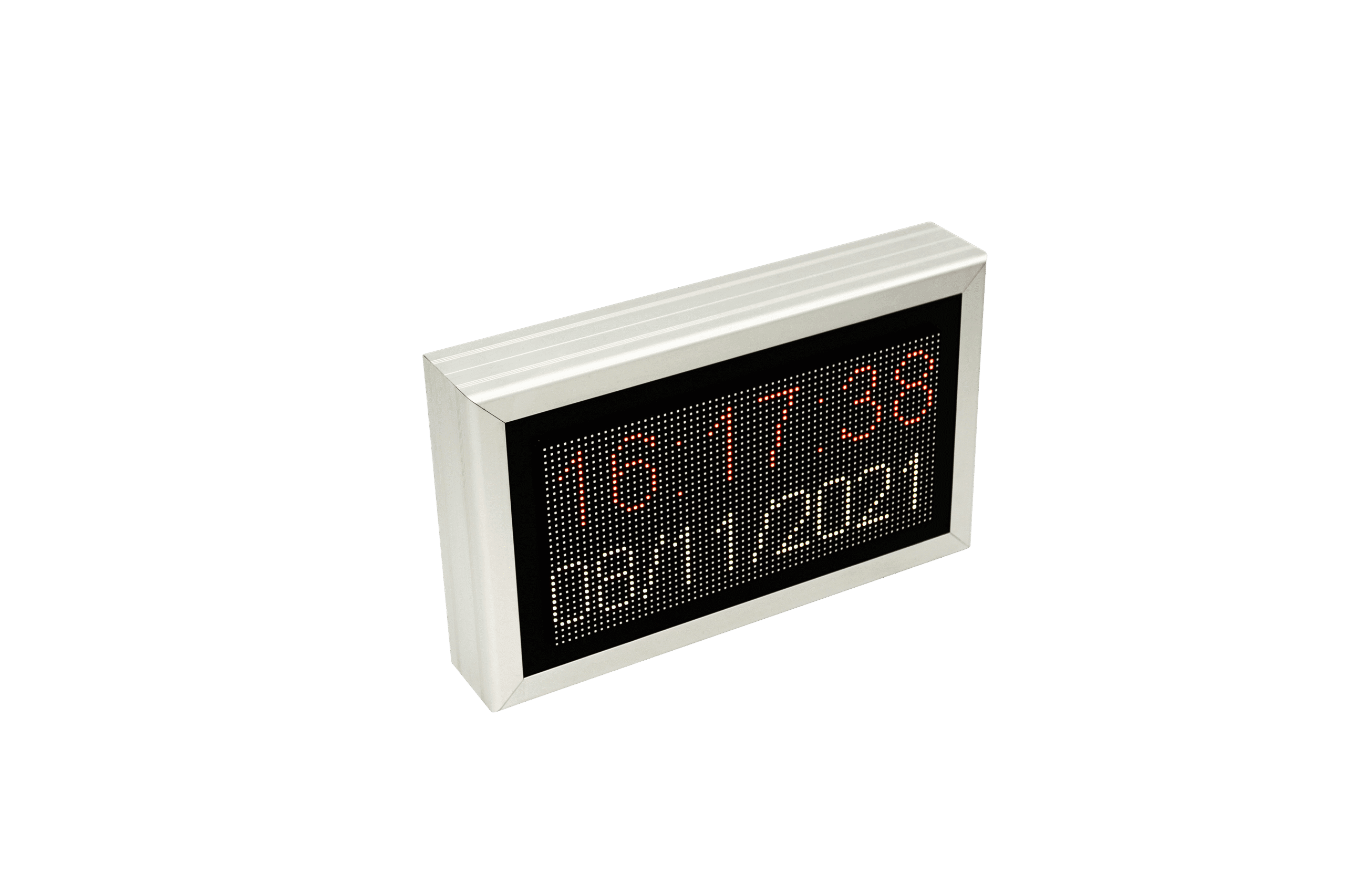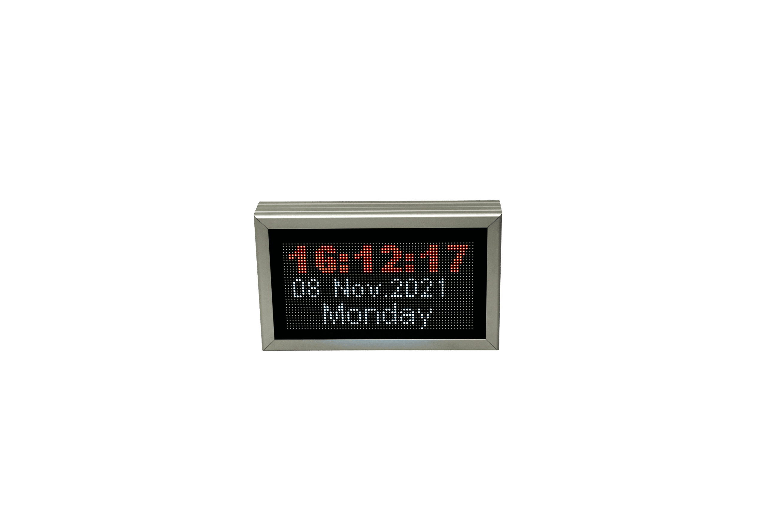 Afiseaza ora, data si ziua saptamanii, iar optional poate integra temperatura sau mesaje personalizate. Datorita tehnologiei RGB, continutul poate fi redat in culori diferite, adaptate identitatii vizuale a locatiei sau evenimentului.