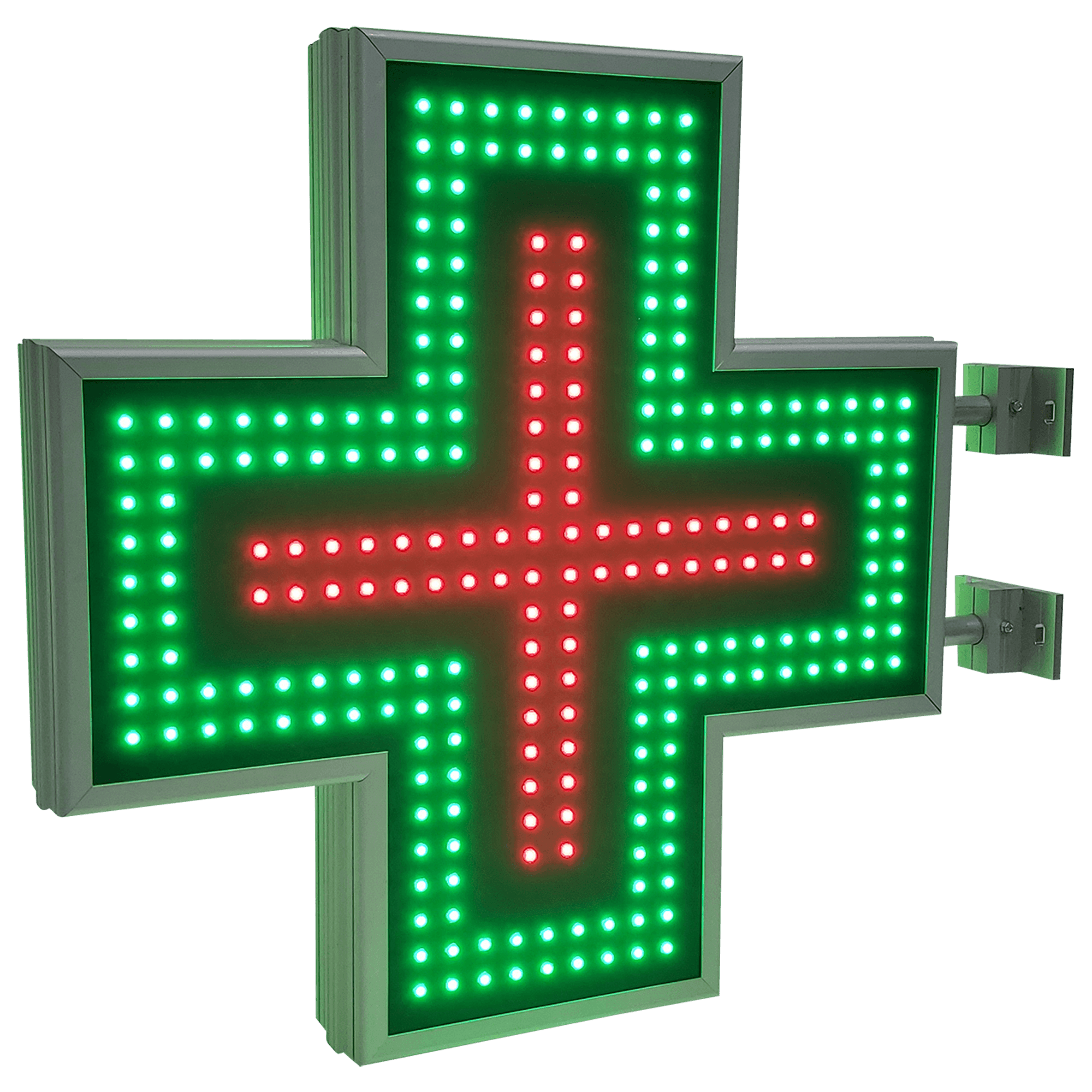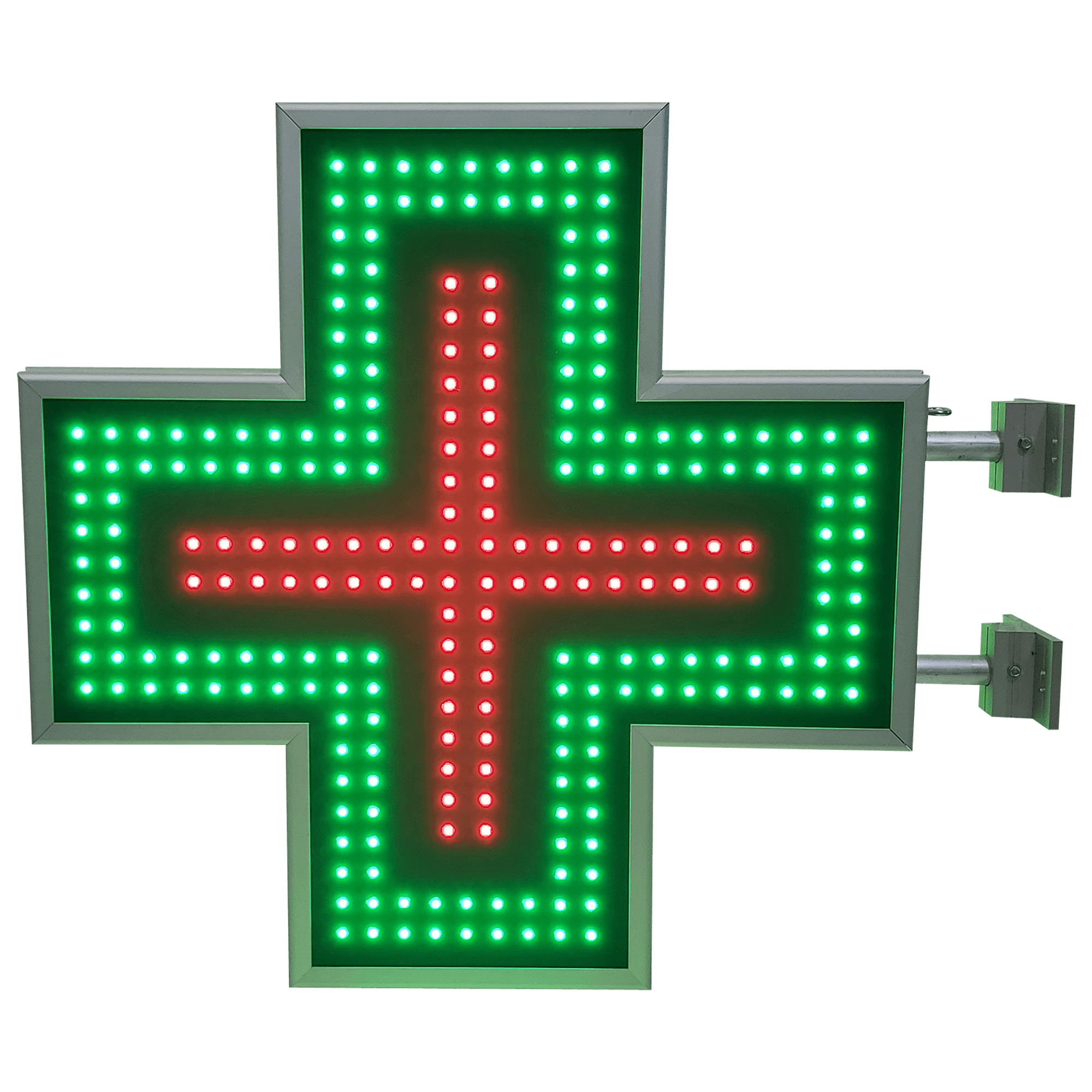 Crucea de farmacie animata de 70 cm, cu LED-uri rosii la interior si verzi pe contur, creeaza un efect vizual distinct si usor de recunoscut in orice context urban.