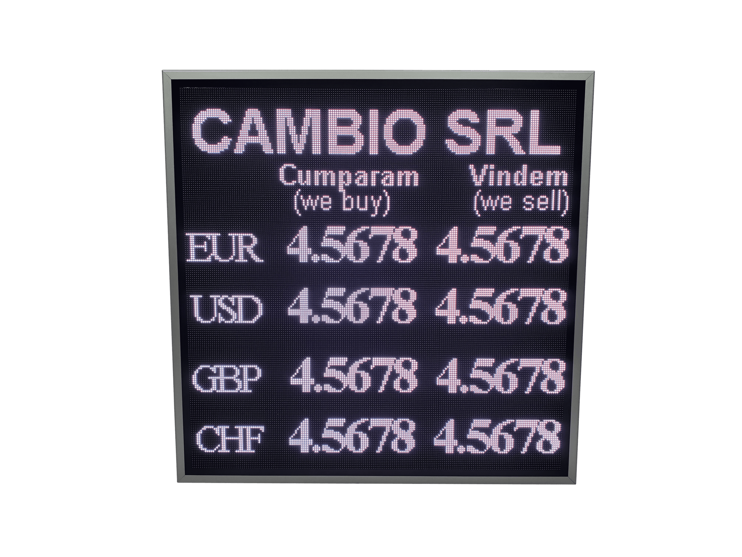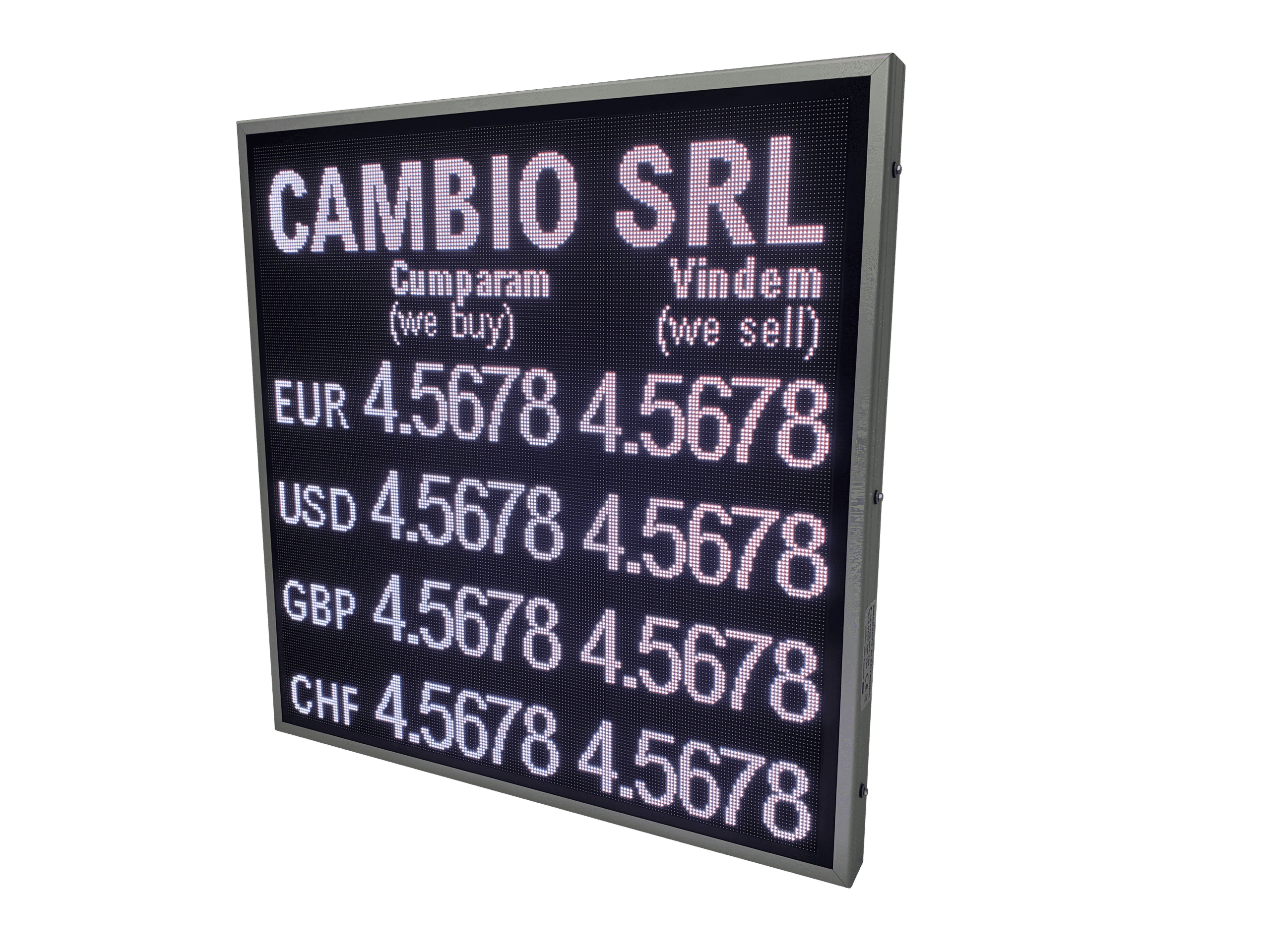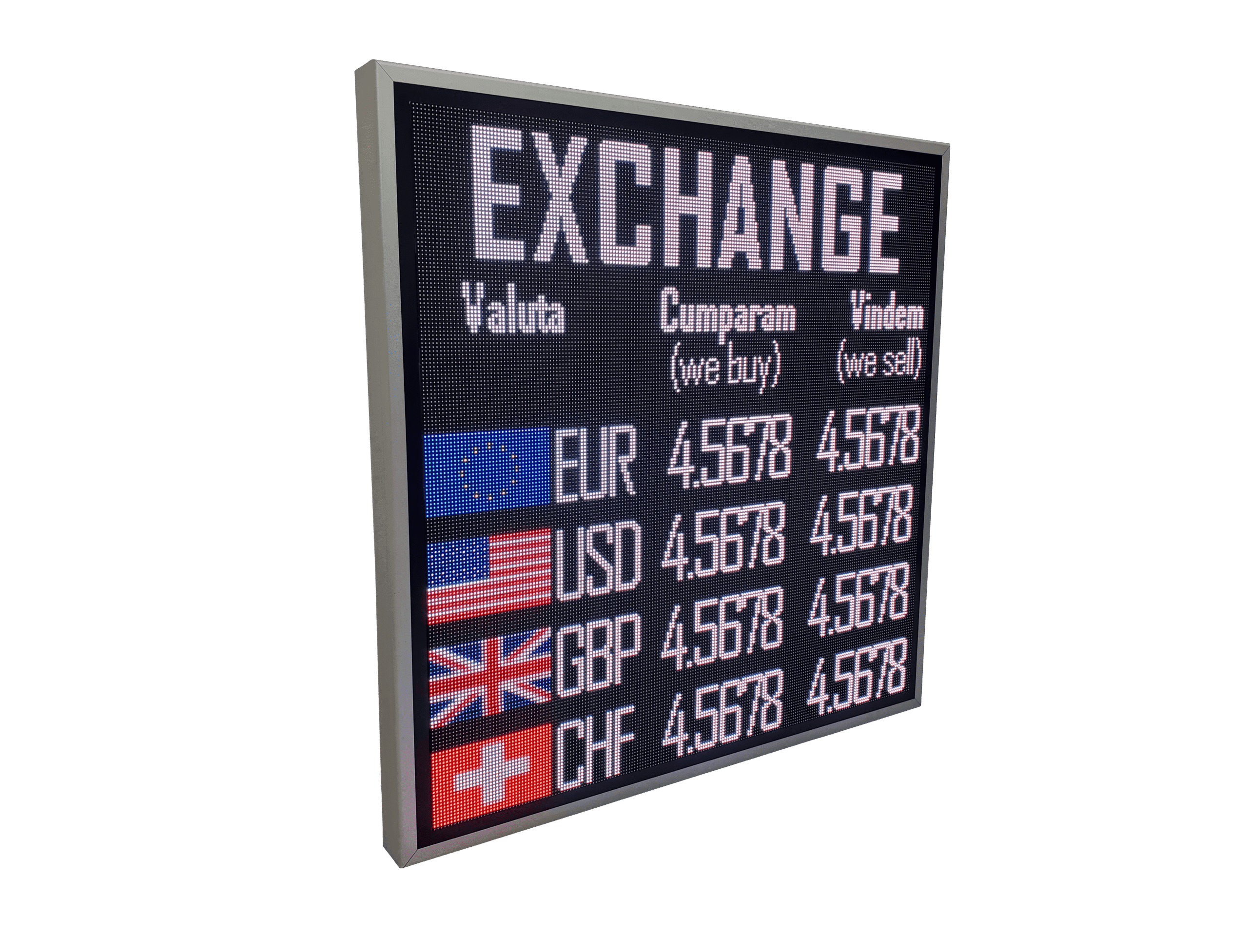 Afisaj LED full color destinat caselor de schimb valutar, proiectat pentru utilizare atat in vitrina, cat si in mediul exterior.