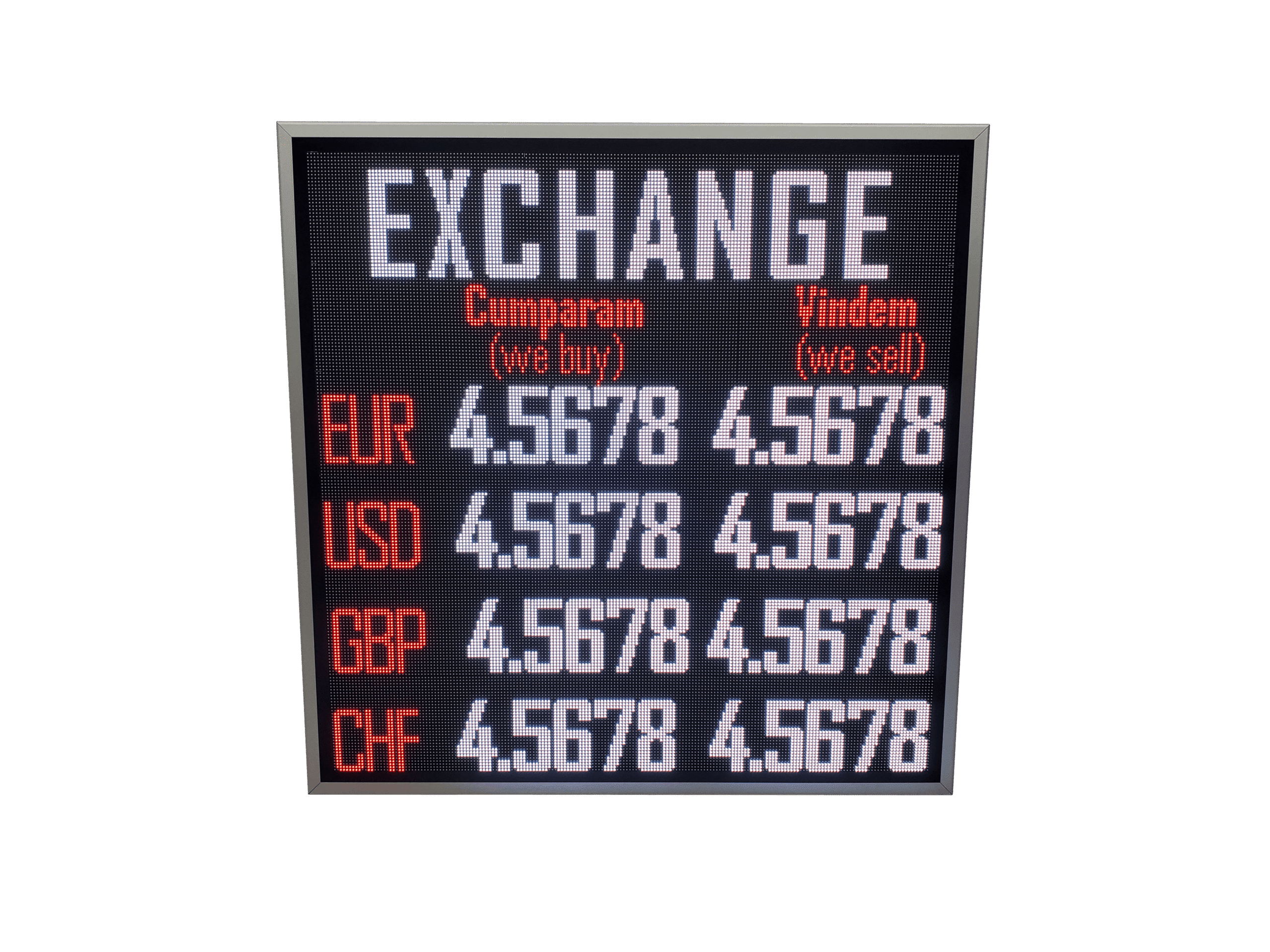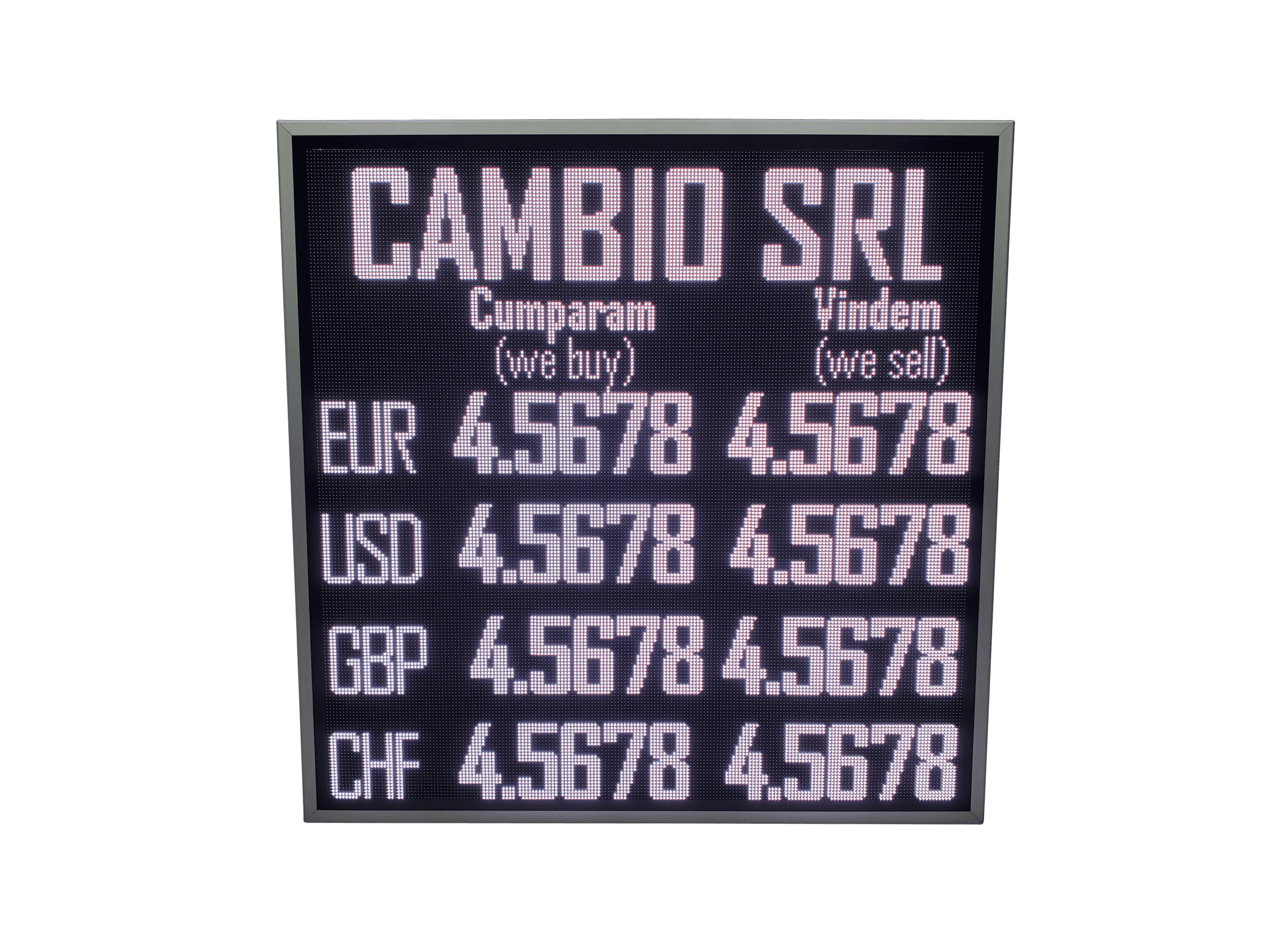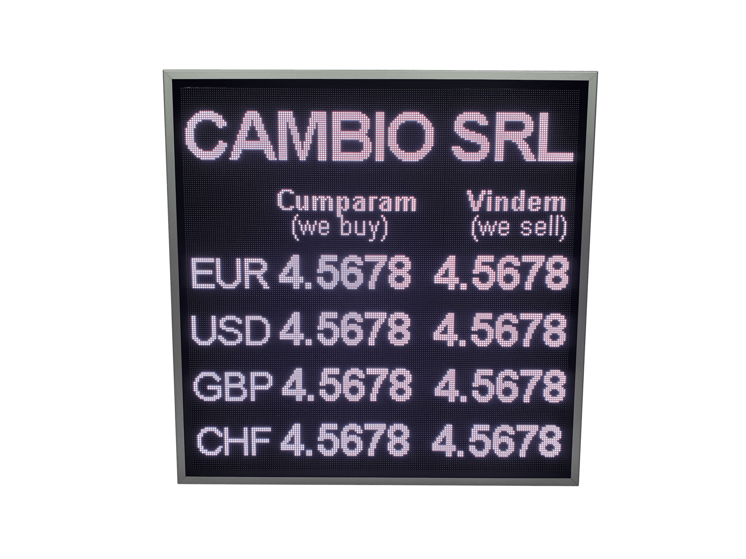 Afisaj LED full color destinat caselor de schimb valutar, proiectat pentru utilizare atat in vitrina, cat si in mediul exterior.