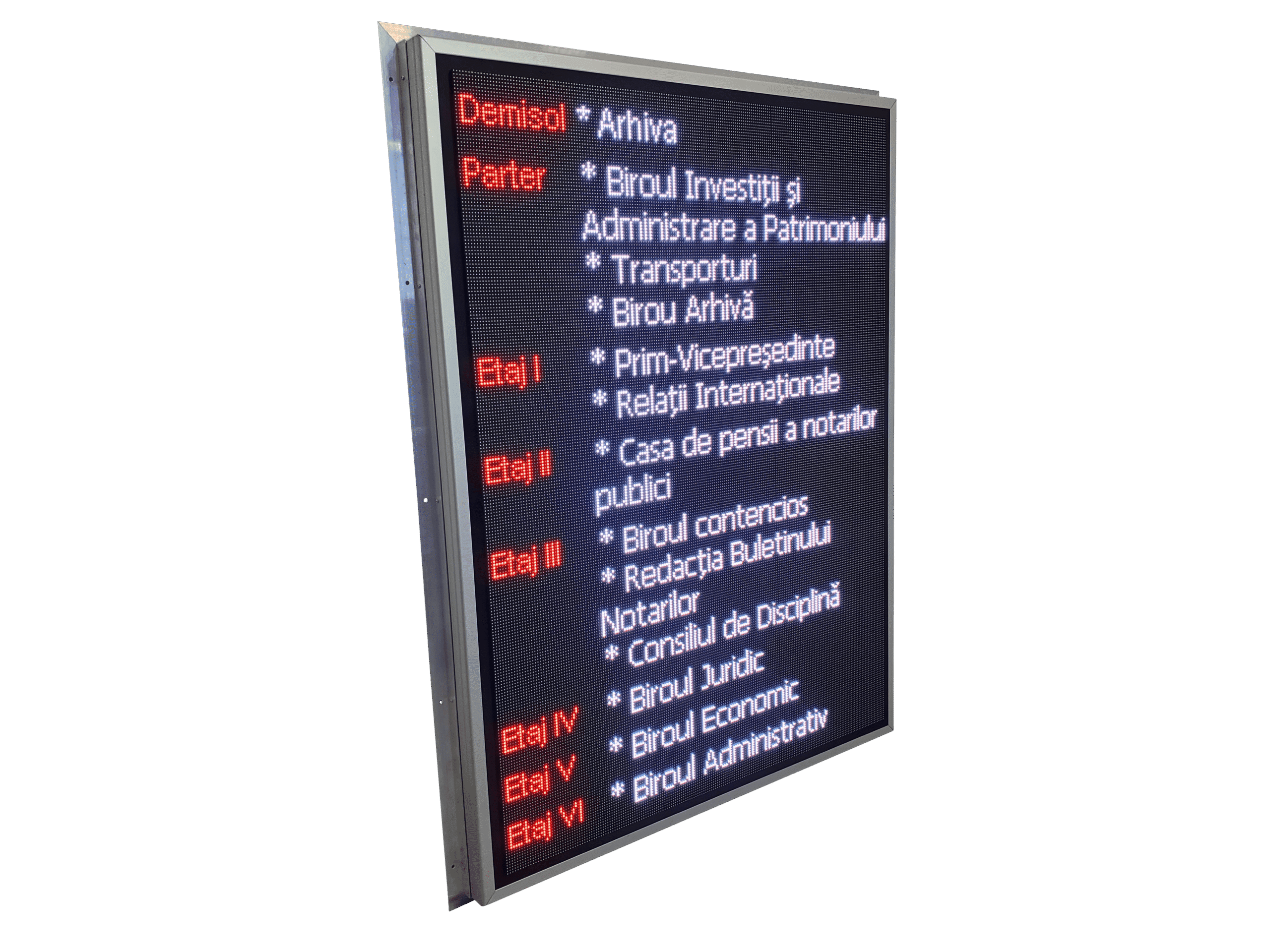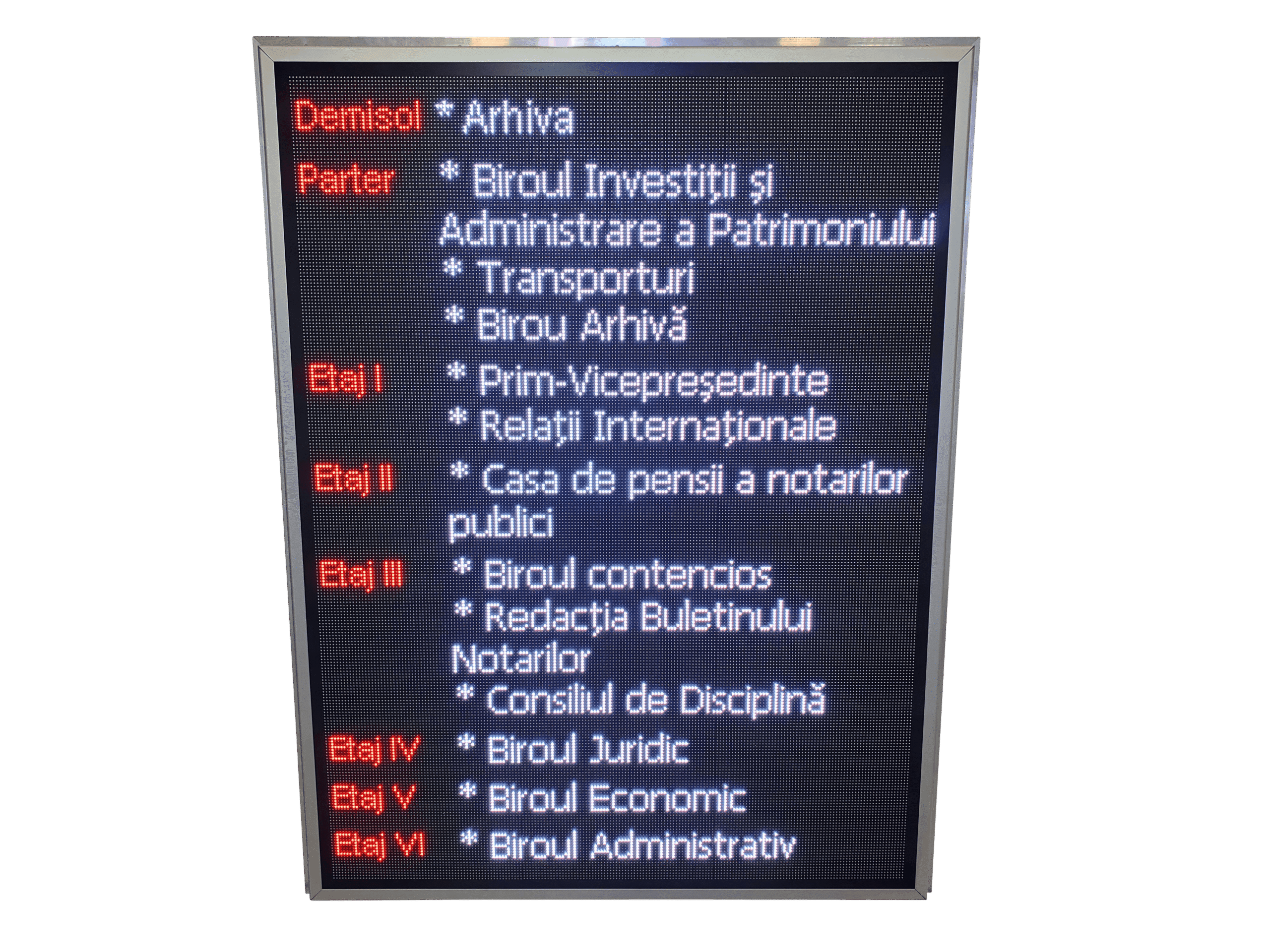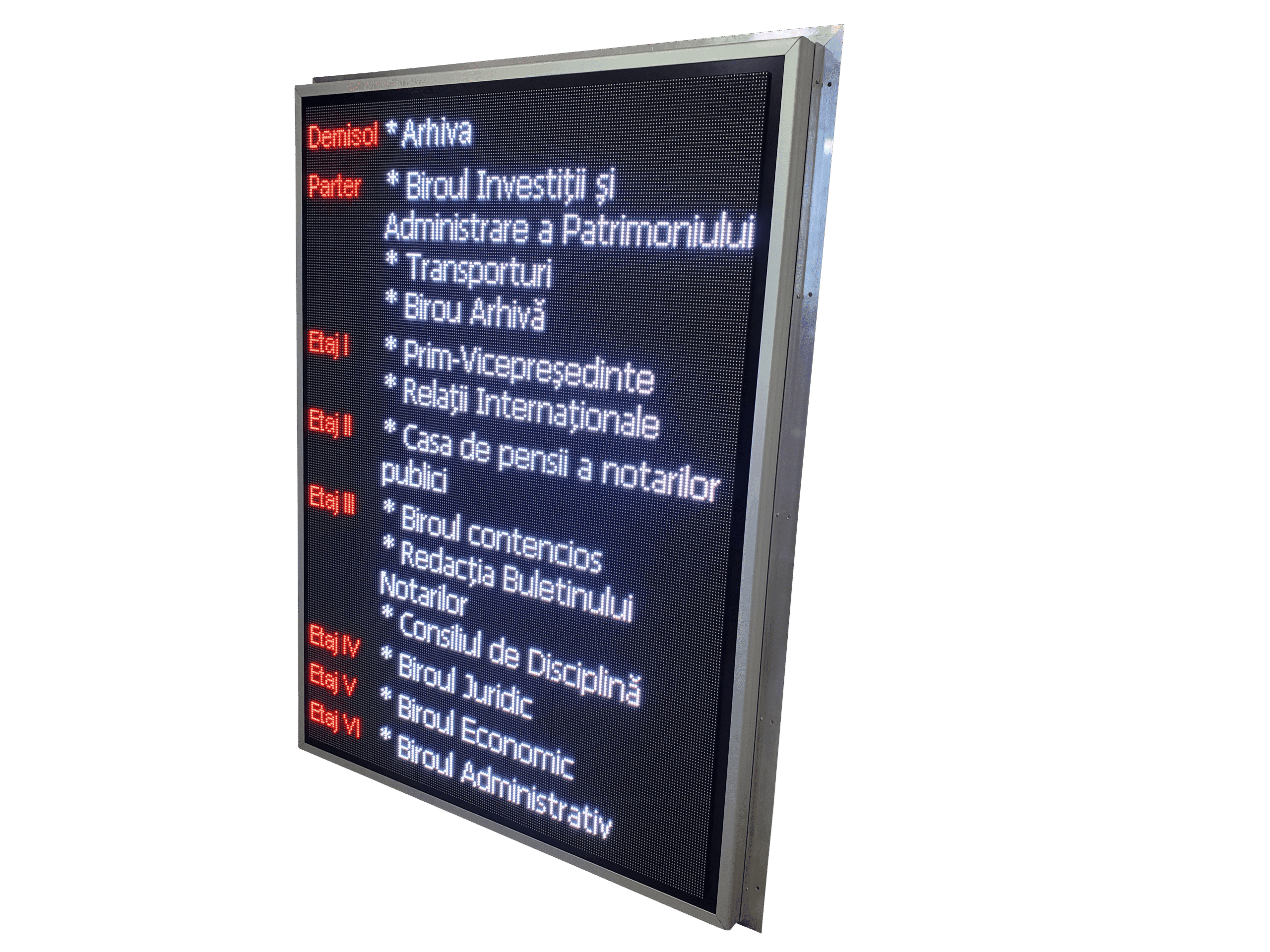 Panou cu LED-uri RGB conceput pentru afisarea clara a mesajelor informative, precum repartizarea birourilor pe etaje, directii sau indicatii utile pentru vizitatori. Afisajul ajuta la orientarea rapida in cladiri de birouri, centre medicale sau spatii comerciale, reducand confuzia si timpul de cautare.