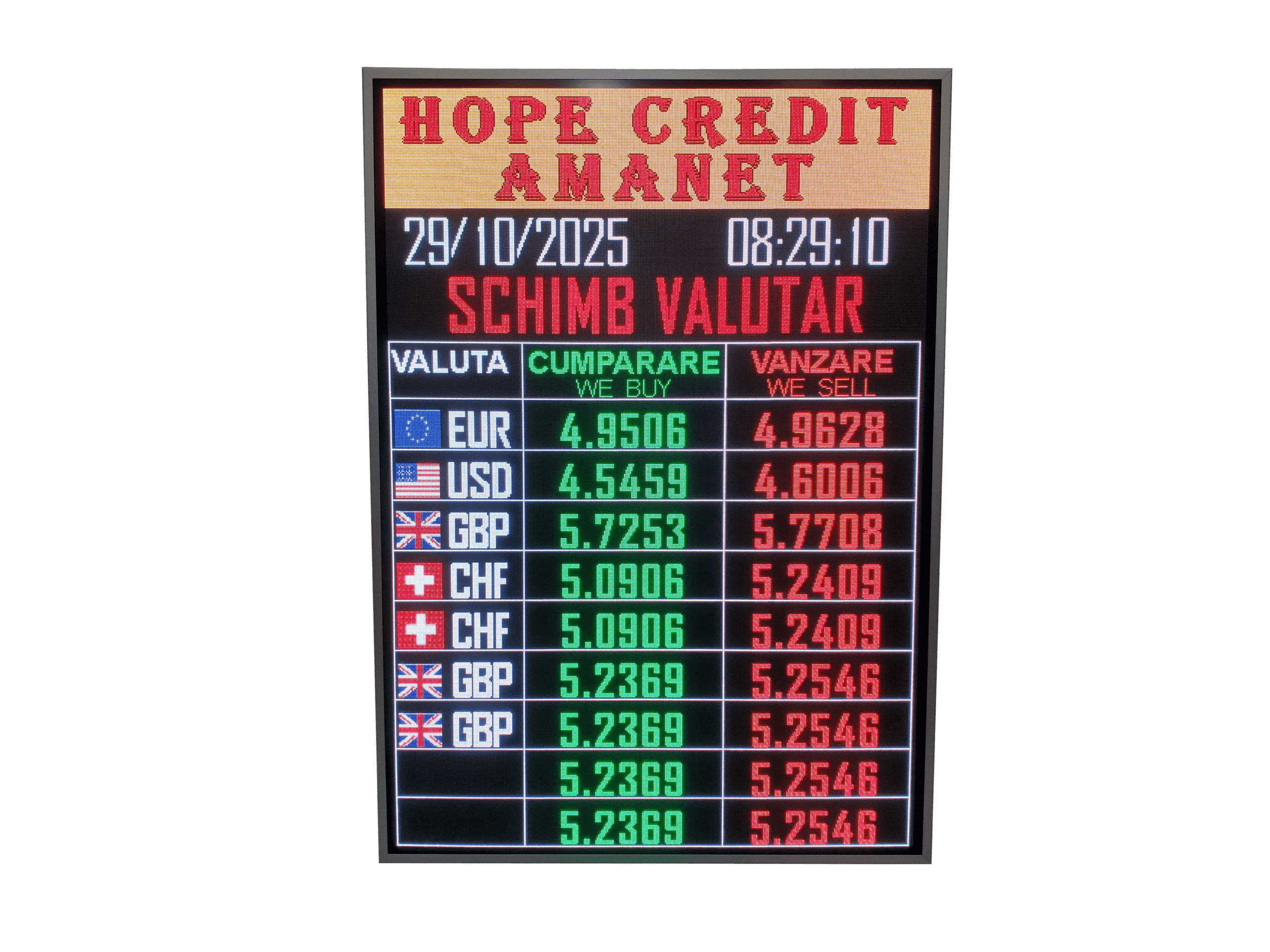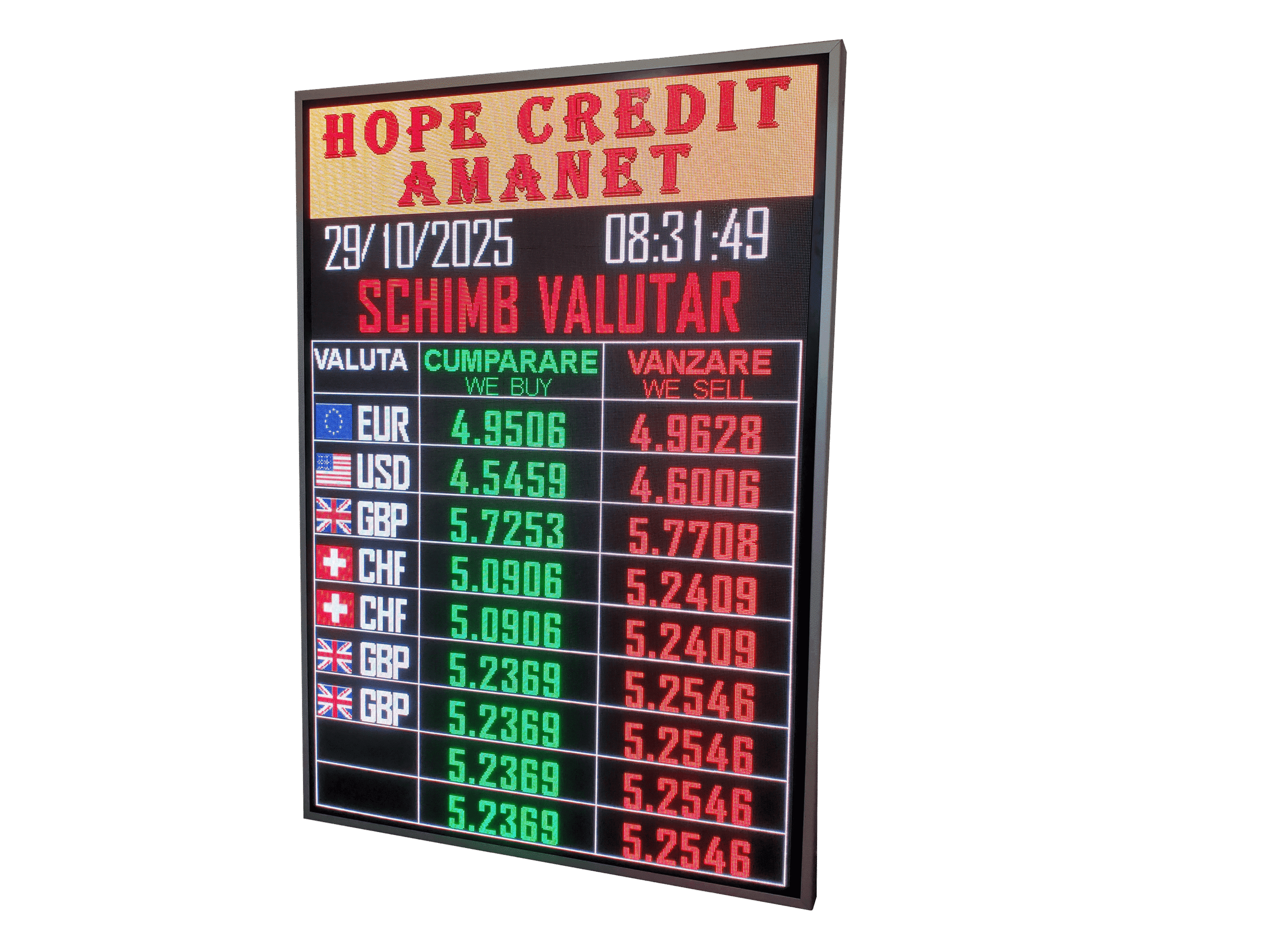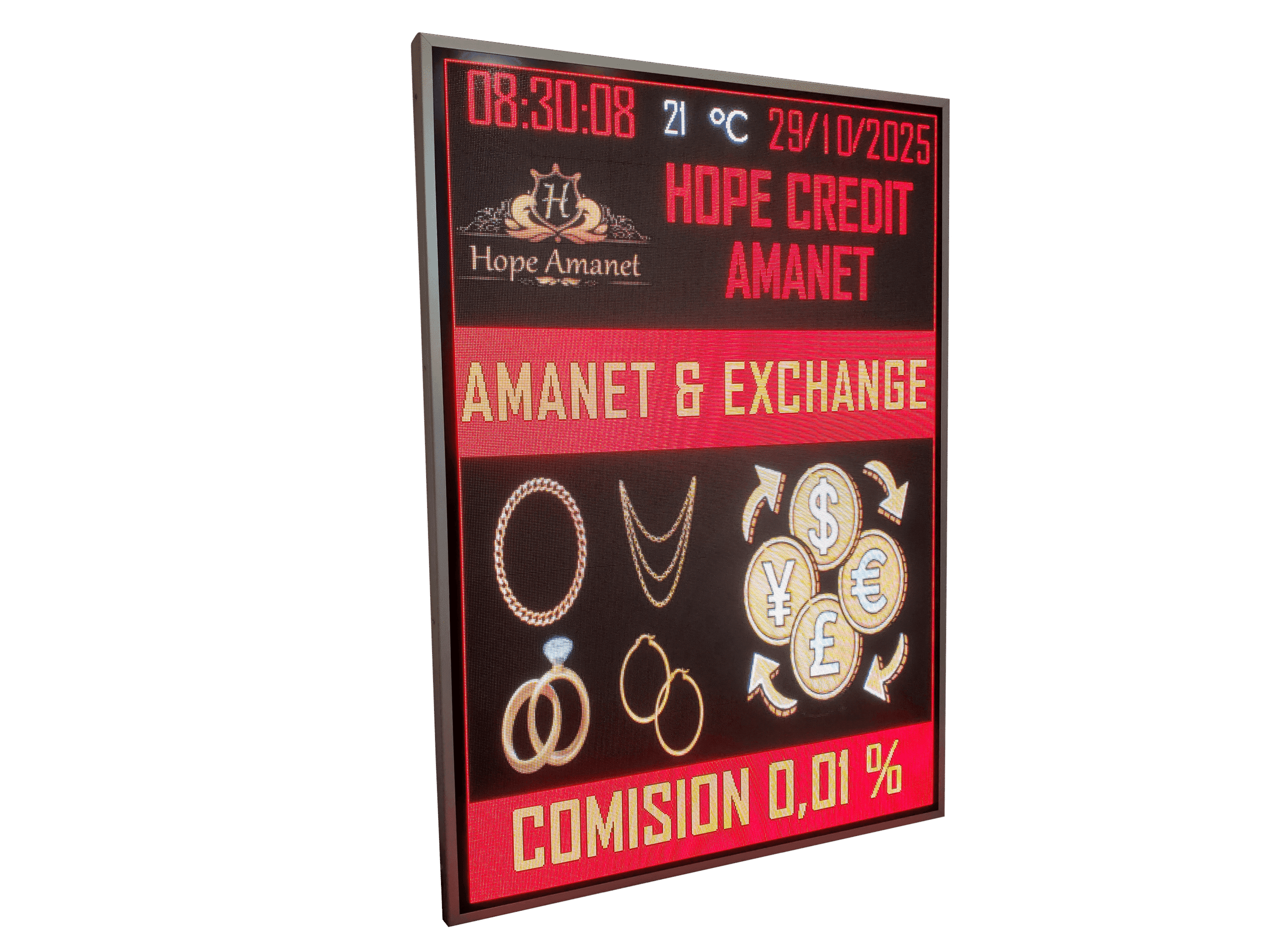 Panou publicitar LED EXTERIOR 1210mm x 1690mm, rezolutie 364 x 520 P3, model FULL COLOR pentru CASE DE AMANET si SCHIMB VALUTAR