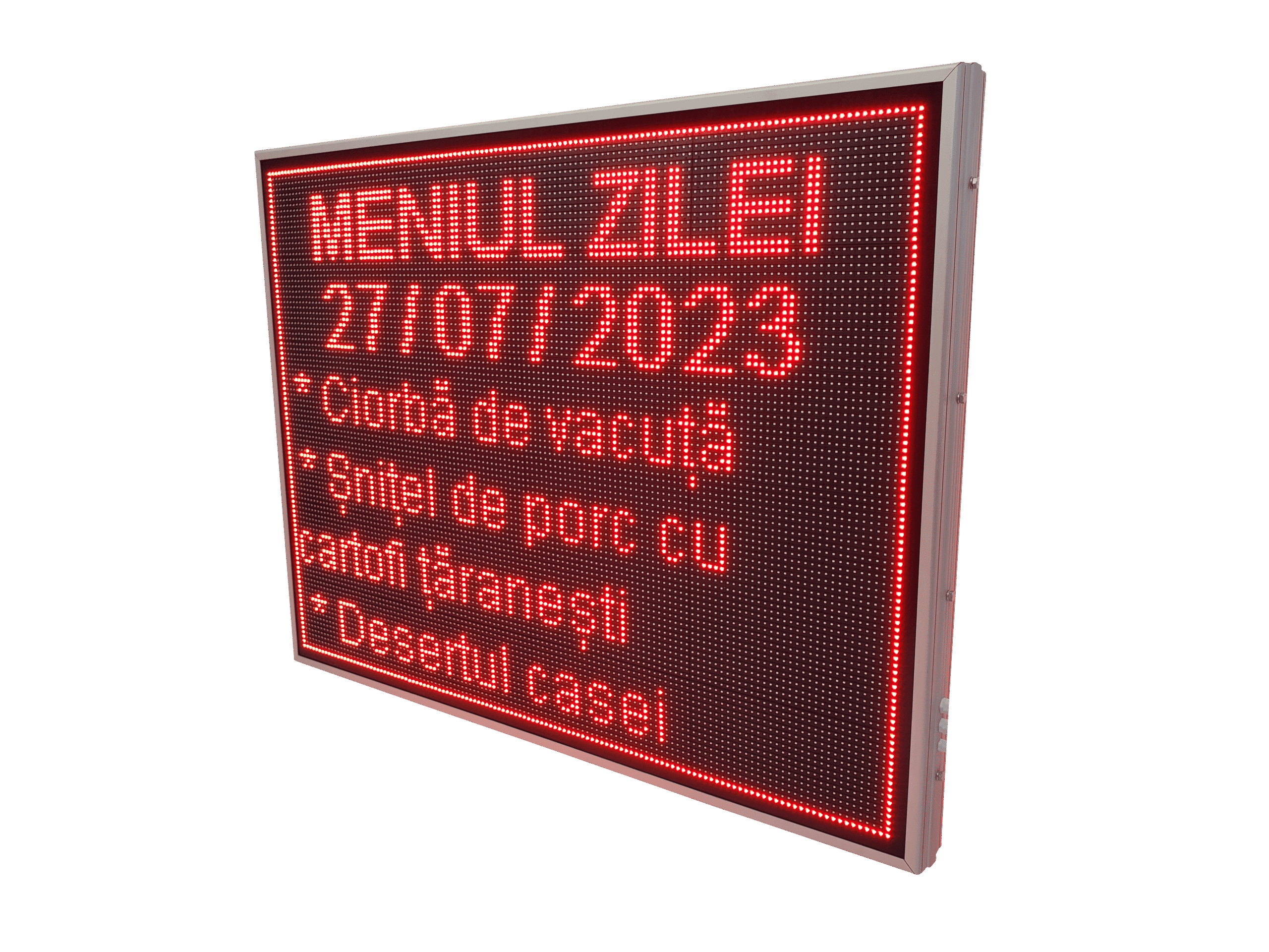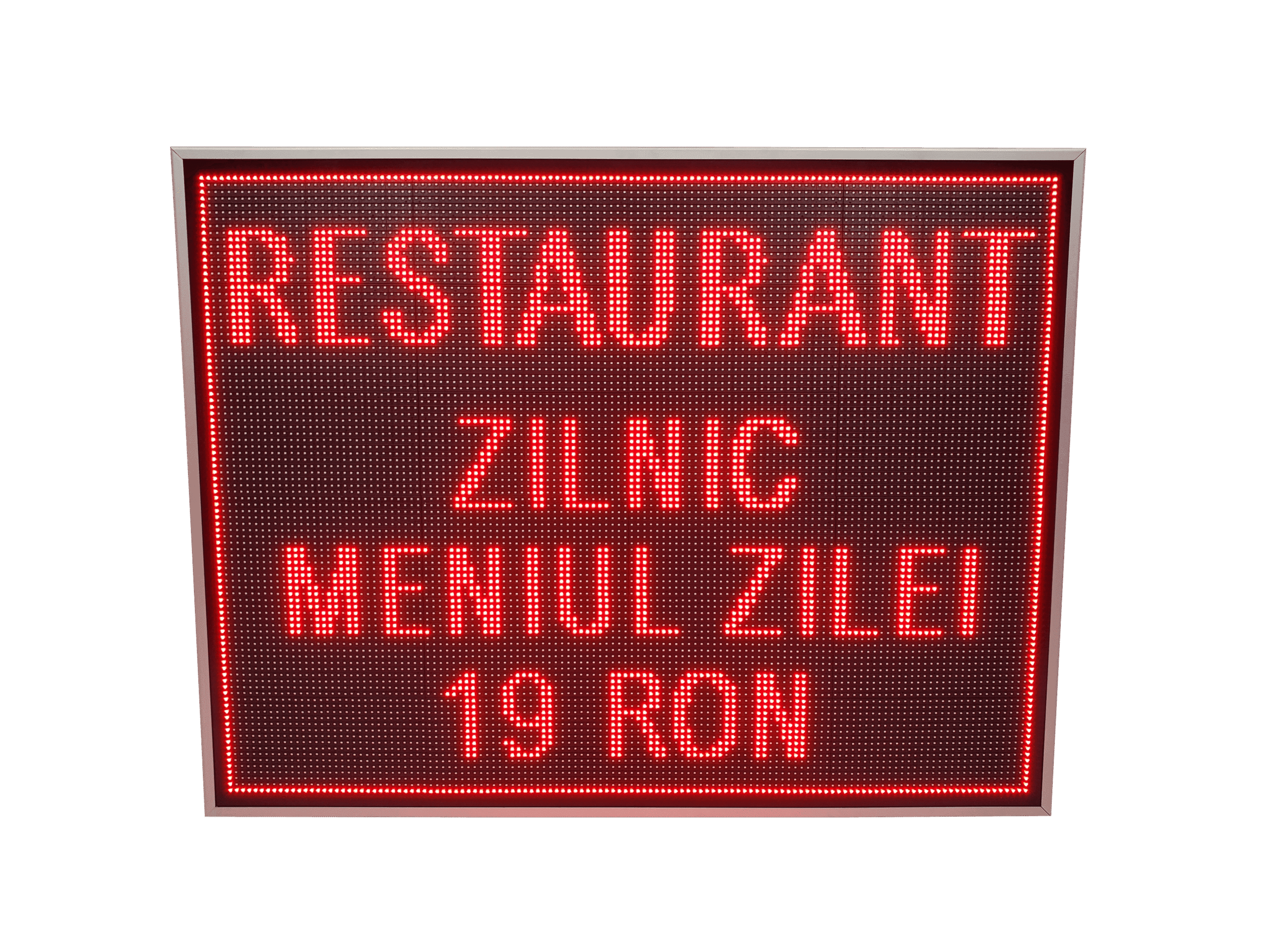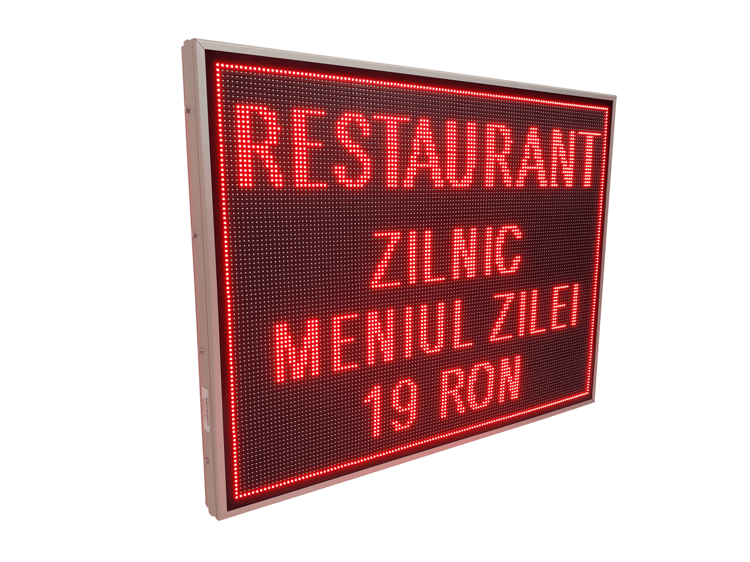 Afișaj electronic P10 cu LED-uri roșii, realizat pentru restaurant, ideal pentru afișarea programului de funcționare, a meniului zilei sau a ofertelor speciale. Lumina roșie oferă un contrast puternic și este ușor de observat atât ziua, cât și seara, atrăgând atenția celor care trec prin fața locației.
